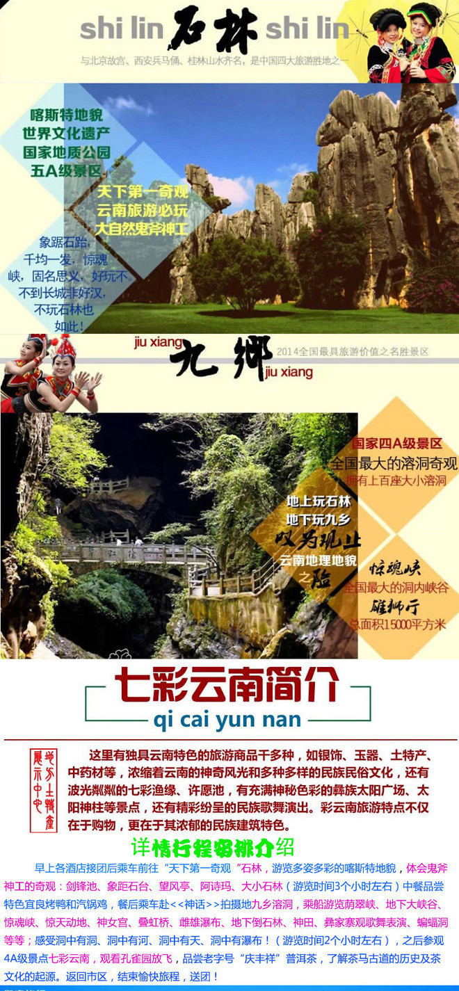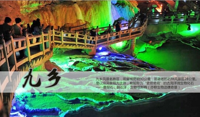指定地点(泰丽国际大酒店门口集合)出发前往参观游览---石林风景区、景区环保车自理25元/人,体会鬼斧神工的“天下第一奇观”游览(大、小石林、双鸟渡食、象锯石台、千钧一发、望风亭、剑峰池、阿诗玛遗像)畅游2亿7千万年前浩瀚海洋之海底,一边漫步在世界最大的喀斯特地质公园:乃古石林、大叠水、长湖、月湖、芝云洞、奇风洞``等等组成;一边聆听阿诗玛的故事;(游览约150分钟)游览---九乡溶洞风景区(含游船、含索道)九乡溶洞群发源于六亿年前的古老白云岩中,总计有大小溶洞上百座,被称为溶洞之乡。乘船游览荫翠峡、地下大峡谷、惊魂峡、惊天动地、神女宫、叠虹桥、雌雄瀑布、地下倒石林、神田、彝家寨观歌舞表演、蝙蝠洞等等;感受洞中有洞、洞中有河、洞中有天、洞中有瀑布!后前往参观七彩云南,品尝高原茶艺,欣赏茶艺表演!后返回昆明19:30左右抵达昆明后散团结束旅程!
